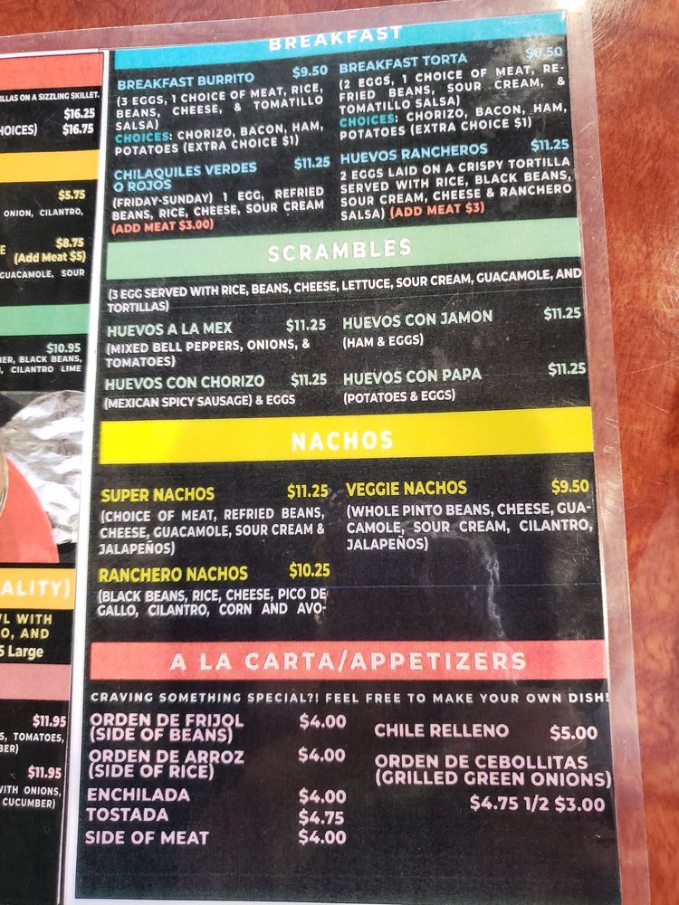 2 eggs, 1 choice, refried beans cheese sour cream & tomatillo salsa. Choices: chorizo, bacon, ham, potatoes, extra choice for an additional charge.