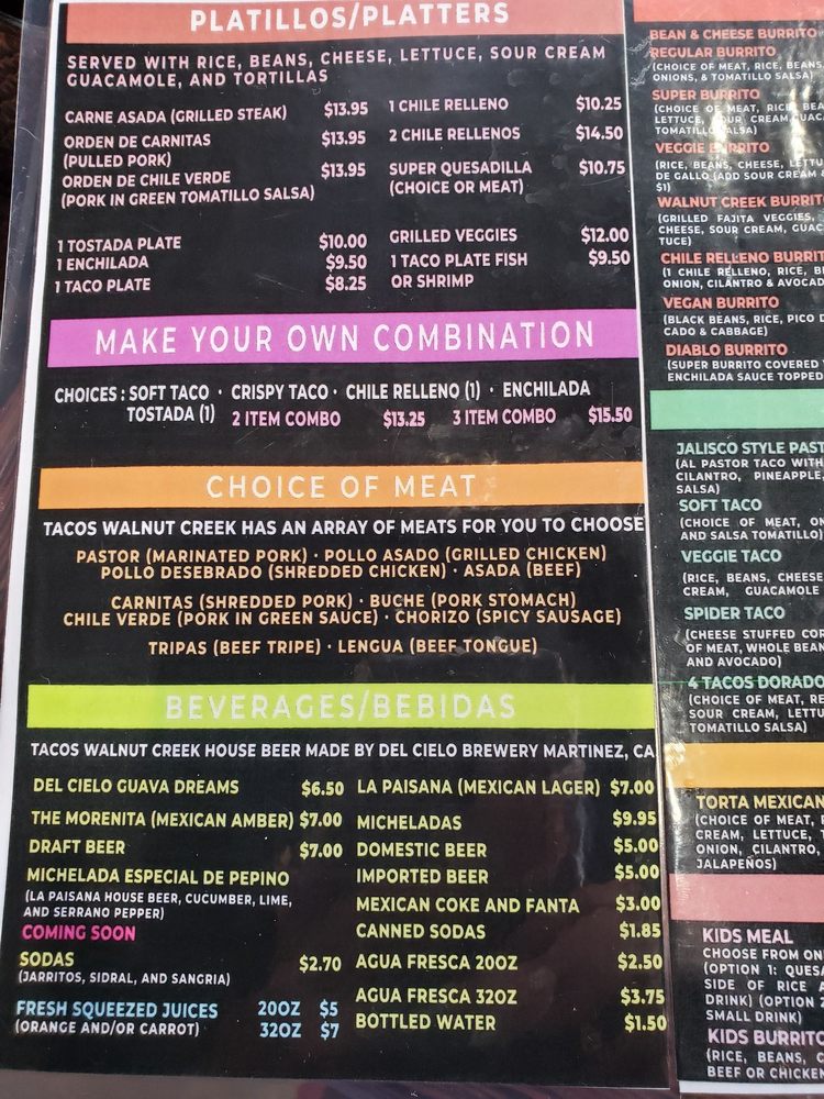 Introducing Tacos Walnut Creek, a hub for authentic and delicious New Mexican cuisine in Walnut Creek, CA. This cozy spot offers a variety of menu options, including tacos, burritos, and more. Their Carne En Su Jugo, a beef broth bowl with carne asada, bacon, and avocado, is a must-try. The Taco Salad Bowl and Spider Taco are favorites among customers for their flavors and generous portions. Tacos Walnut Creek also caters to vegans and vegetarians with numerous plant-based options. The welcoming atmosphere and fast counter service make it a great spot for a quick and satisfying meal. With reasonable prices and ample parking options, Tacos Walnut Creek is a go-to spot for locals and visitors alike. Don't miss out on their Super Burrito or quesabirria with consome - both are sure to delight your taste buds.